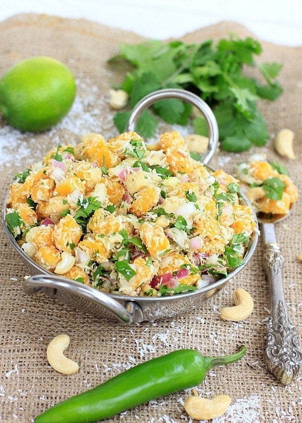 - Add mango, onion, and cilantro to cashew/coconut mixture,and squeeze lime juice on top. Add jalapeno if desired, and stir well to combine. Place in refrigerator until ready to use.