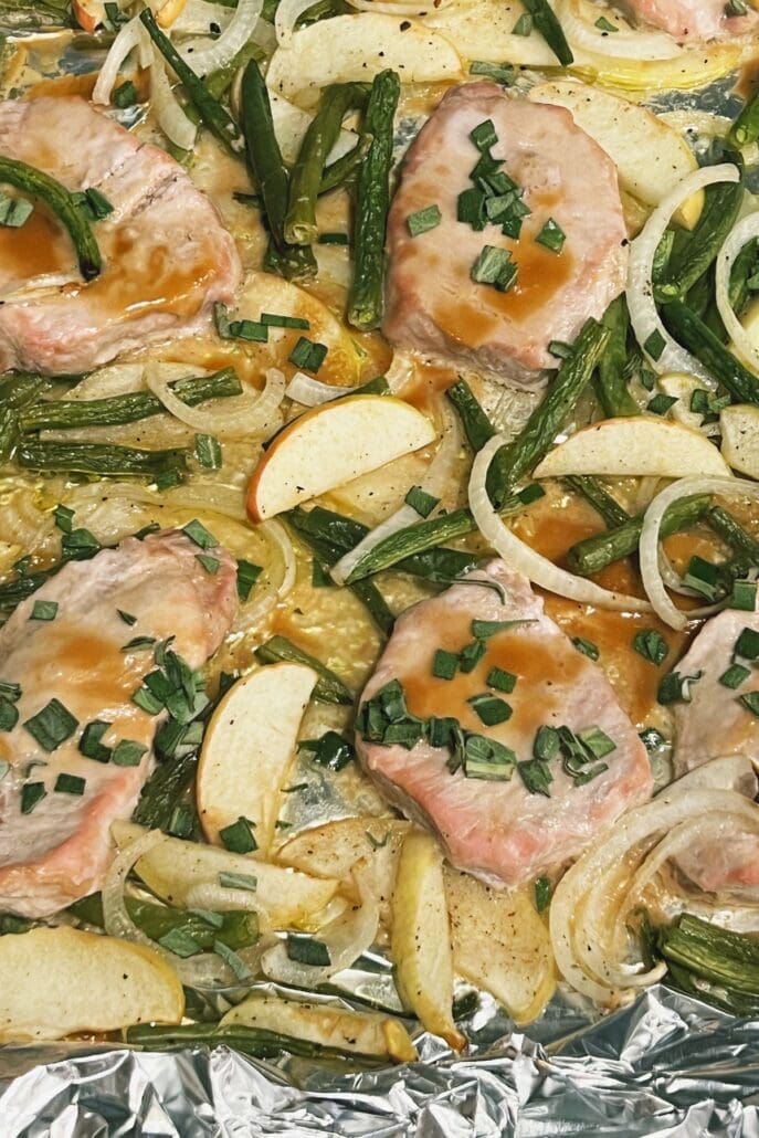 Sheet Pan Pork Chops w/ Apples, Green Beans, & Maple Dijon